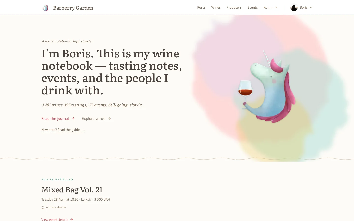 For years this site has shown you my wines, my notes, my cellar. Useful, I hope, but one-way. The plumbing is now there for you to have your own notebook under the same roof - same shell, same typography, same analytics - alongside mine rather than mixed in with them.